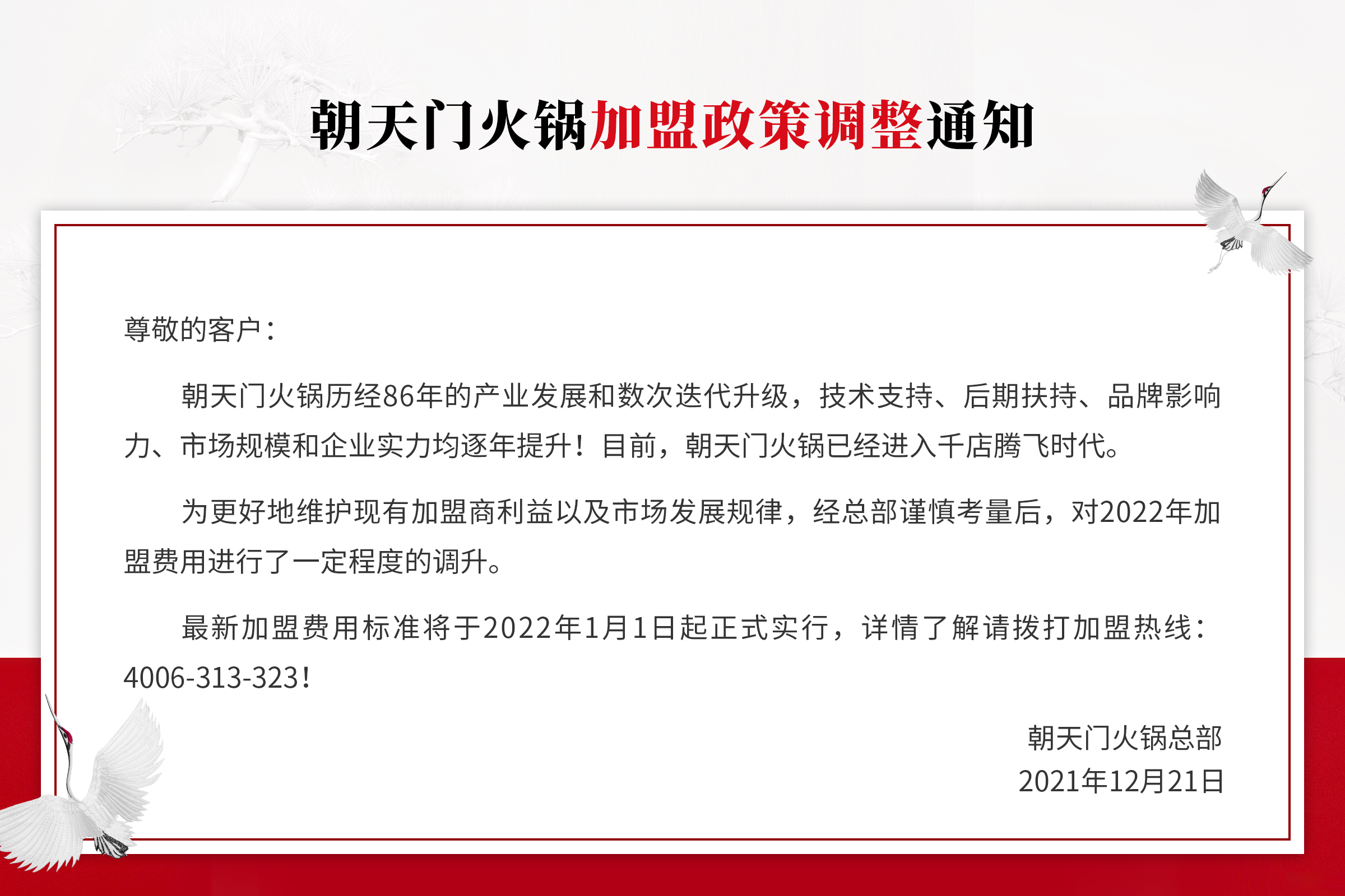 為更好地維護現有加盟商利益以及市場發展規律,經總部謹慎考量后,對2022年加盟費用進行了一定程度的調升。最新加盟費用標準將于2022年1月1日起正式實行,詳情了解請撥打加盟熱線:4006-313-323!